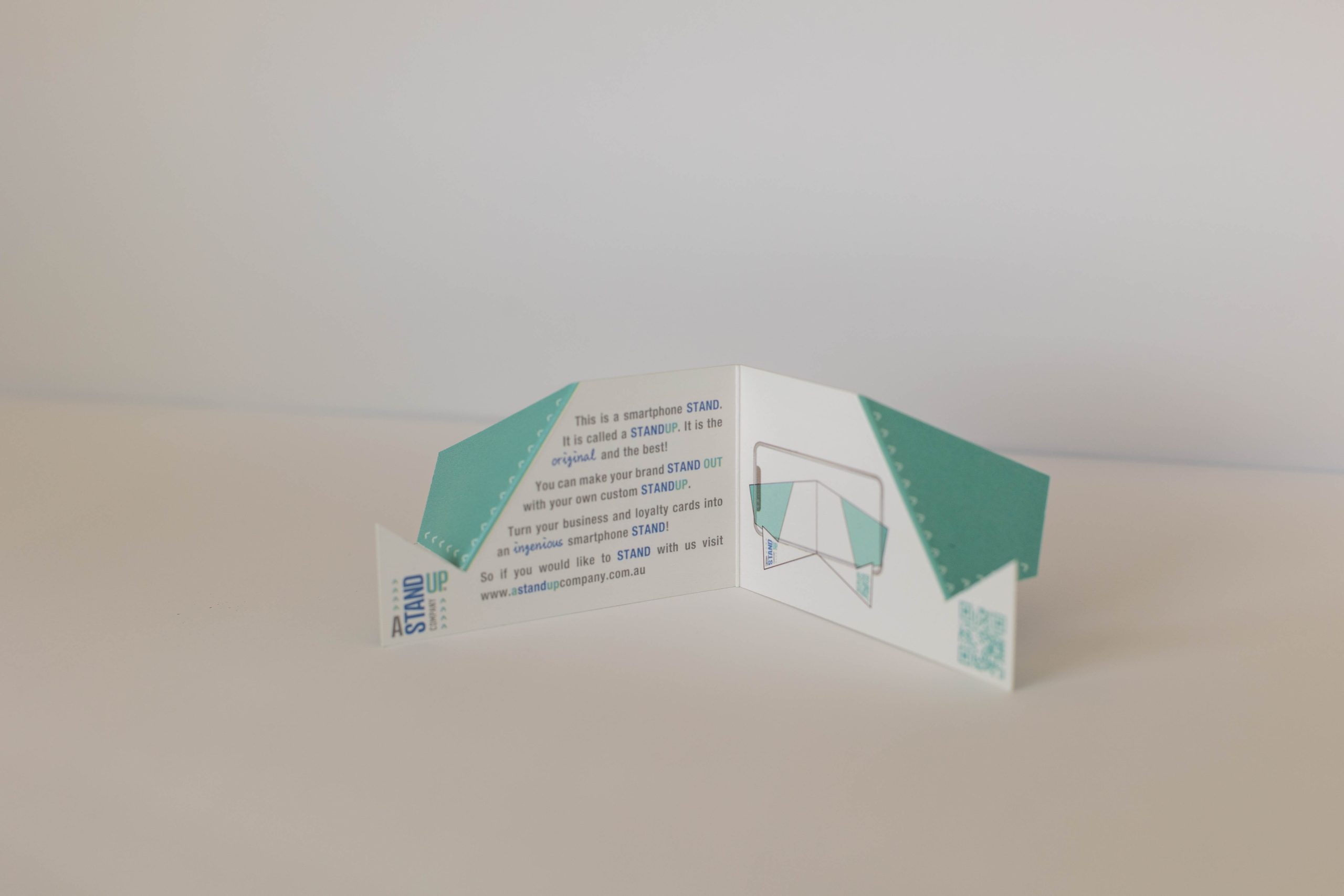 This isn’t just a smartphone stand, it’s also a brand new piece of marketing collateral for businesses to connect with their customers. It folds in half to be business card size and is printable on both sides and all panels.